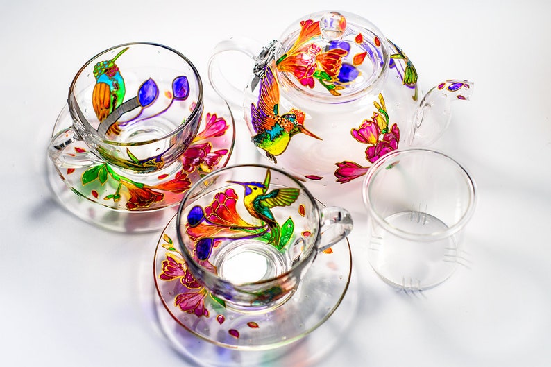 This hand painted tea set includes 1 glass teapot with infuser and 2 tea cups with saucer. It features the exclusive artwork of hummingbirds and flowers.