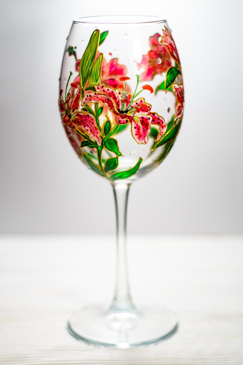 Flower Wine Glass, Hand Painted Floral Stargazer Lily Gift, Pink Lilies Flowers Gift